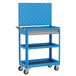 Корпус выполнен из листовой стали толщиной от 0,6 до 1,5 мм., покрыт полимерной порошковой краской. С перфорированной панелью для навесных элементов и выдвижным ящиком на шариковых телескопических направляющих. Общая равномерно-распределённая нагрузка на тележку - до 100 кг. Верхняя и средняя полка имеют высоту борта 40 мм., нижняя полка имеет высоту борта 60 мм. Размер 950х700х450 мм.