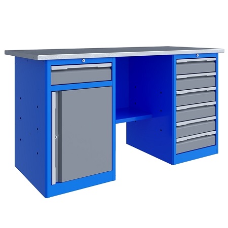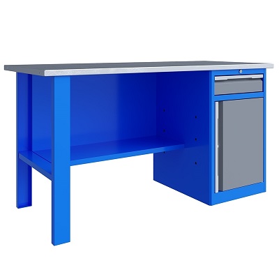 Верстак однотумбовый поставляется в разобранном виде. Нагрузка на столешницу до 600 кг. Стандартный цвет: корпус - серый глянец RAL 7030, ящики и двери тумб - синий RAL 5017. Размеры:855x1400x700 мм. Вес: 76 кг.