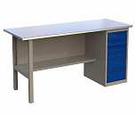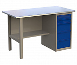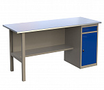 Верстак однотумбовый поставляется в разобранном виде. Нагрузка на столешницу до 600 кг. Стандартный цвет: корпус - серый глянец RAL 7030, ящики и двери тумб - синий RAL 5017. Размеры:855x1400x700 мм. Вес: 65 кг.