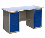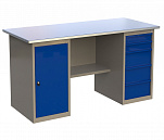 Верстак двухтумбовый поставляется в разобранном виде (4 элемента). Нагрузка на столешницу до 600 кг. Стандартный цвет: корпус - серый глянец RAL 7030, ящики и двери тумб - синий RAL 5017. Размеры: 855x1400x700 мм. Масса: 78 кг.