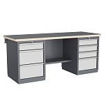 Двухтумбовый. Допустимая нагрузка на столешницу 1000 кг. Опорные элементы выполнены сварными из холоднокатаной стали. Для выполнения сборочных, ремонтных, слесарных, монтажных и других видов работ на производстве, в сервисных центрах, мастерских, гаражах, а также для обучения технологии в учебных заведениях. Комплектуется полкой-стенкой, расположенной под столешницей для удобного размещения габаритного инструмента и оснастки. Размеры верстака: 855x1796x696 мм. Вес: 133 кг. Поставляется в 4 комплектациях на выбор.
