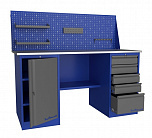 Двухтумбовый. Допустимая нагрузка на столешницу 1000 кг. Опорные элементы выполнены сварными из холоднокатаной стали. Для выполнения сборочных, ремонтных, слесарных, монтажных и других видов работ на производстве, в сервисных центрах, мастерских, гаражах, а также для обучения технологии в учебных заведениях. Комплектуется полкой-стенкой, расположенной под столешницей для удобного размещения габаритного инструмента и оснастки. Размеры верстака: 855x1596x696 мм. Вес: 98 кг. Поставляется в 4 комплектациях на выбор.