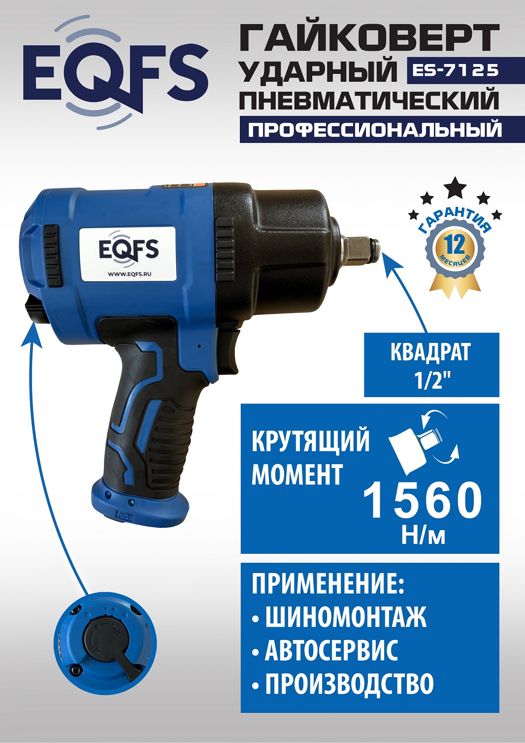 ES-7125 Пневмогайковерт 1/2". ПРОФЕССИОНАЛЬНЫЙ. Позволяет открутить сильно прикипевшую гайку или болт. Устойчив к перегрузкам - работает на индустриальных подшипниках. Ударопрочный - изготовлен из морозо/ударо- устойчивого пластика (облегченный композитный корпус). Обрезиненная рукоятка. Реверс, регулировка крутящего момента – 3 режима. Под головку 1/2”. Крутящий момент 1560 Нм. ВЕС-2,0 кг.