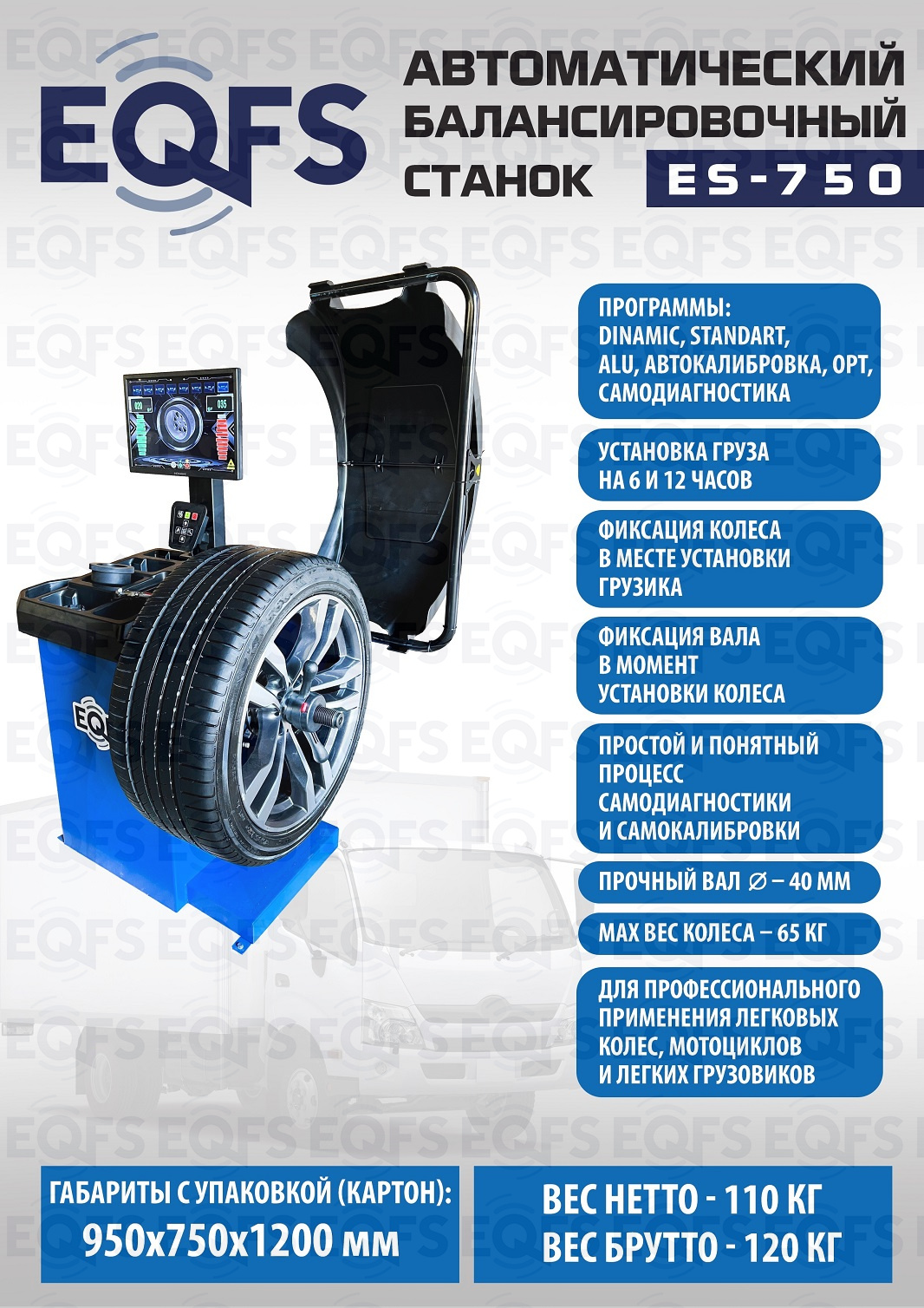 ES-750 Балансировочный станок. Автомат. Для широких колес 315 х R21 от BMW, MB, RANGE ROVER и т.д. Ввод 3-х параметров ( диаметра диска, дистанции и ширины диска), 19-дюймовый LCD монитор с высококачественной 3D-графикой, ультразвуковой датчик ширины. Автодоводчик и лазерная указка места установки грузика. Статическая и динамическая балансировка, ALU-программы для алюминиевых дисков. Программа OPT. Программа разделения и скрытой установки грузиков за спицами SPLIT. Режимы калибровки и самодиагностики. Для балансировки колёс с диаметром колеса до 800 мм. Размеры диска: ширина 3–10” (76-254 мм) , диаметр диска 10–24” (254÷609 мм). Прочный вал Ø - 40мм. Вес колеса 65 кг. Гарантия 18 мес – наш монтаж, 12 мес – самостоятельная установка.