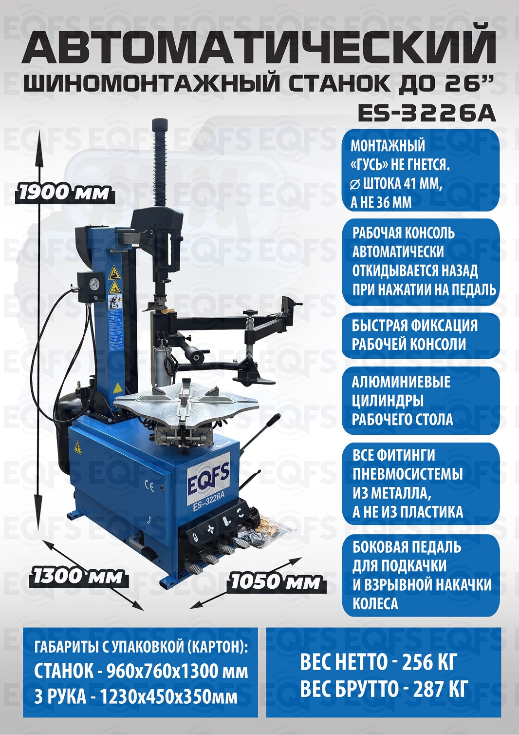 Автоматического шиномонтажного станка ES-3226А. В комплекте взрывная подкачка + «третья рука» для работы с низкопрофильными шинами и RanFlat. Все быстросъемные элементы пневмосистемы выполнены из металла, а не из пластика, что уменьшает вероятность поломки! Зажим 12-26”. Максимальное колесо: Ø 990x355 мм. 220/380В. Масса: 256 кг. Гарантия 12-18 мес. Для покрышек легковых автомобилей, внедорожников, «Спринтеров», «Газелей» и т.п.