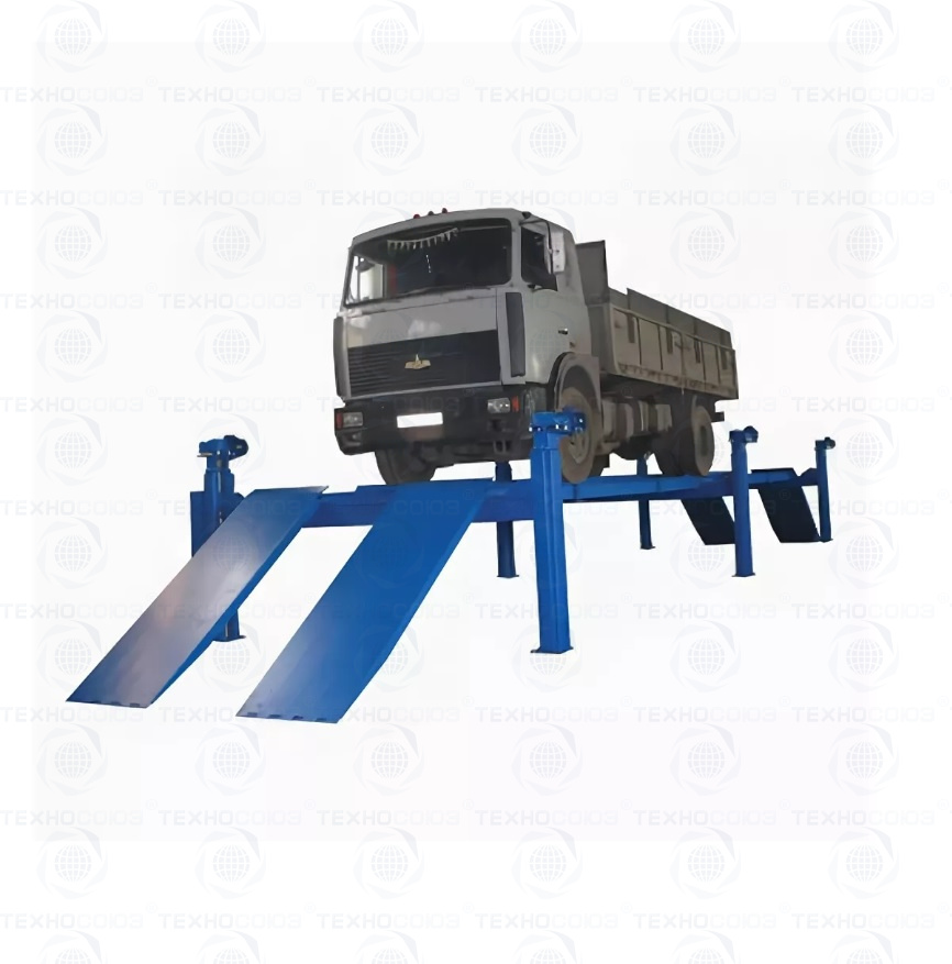 г/п. 25 тонн. Шестистоечный. Электромеханический. Для ремонта грузовых автомобилей и автобусов на любой ровной площадке. Привод червячный редуктор, с концевыми выключателями нажимного действия, ограничивающими ход каретки. Рабочие гайки повышенной прочности и износостойкости. Многоуровневая система безопасности. По отдельному заказу комплектуется установочными рамами. Поставляется в 2 вариантах Стандарт (в помещение) и ТЗ (Для эксплуатации на улице).