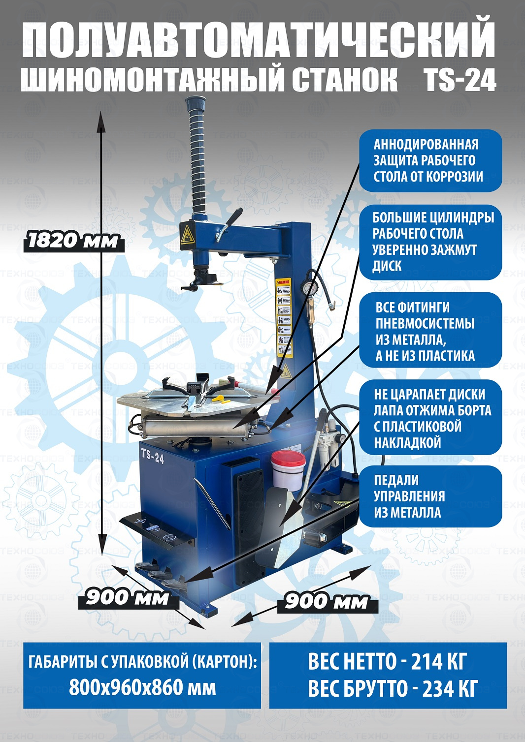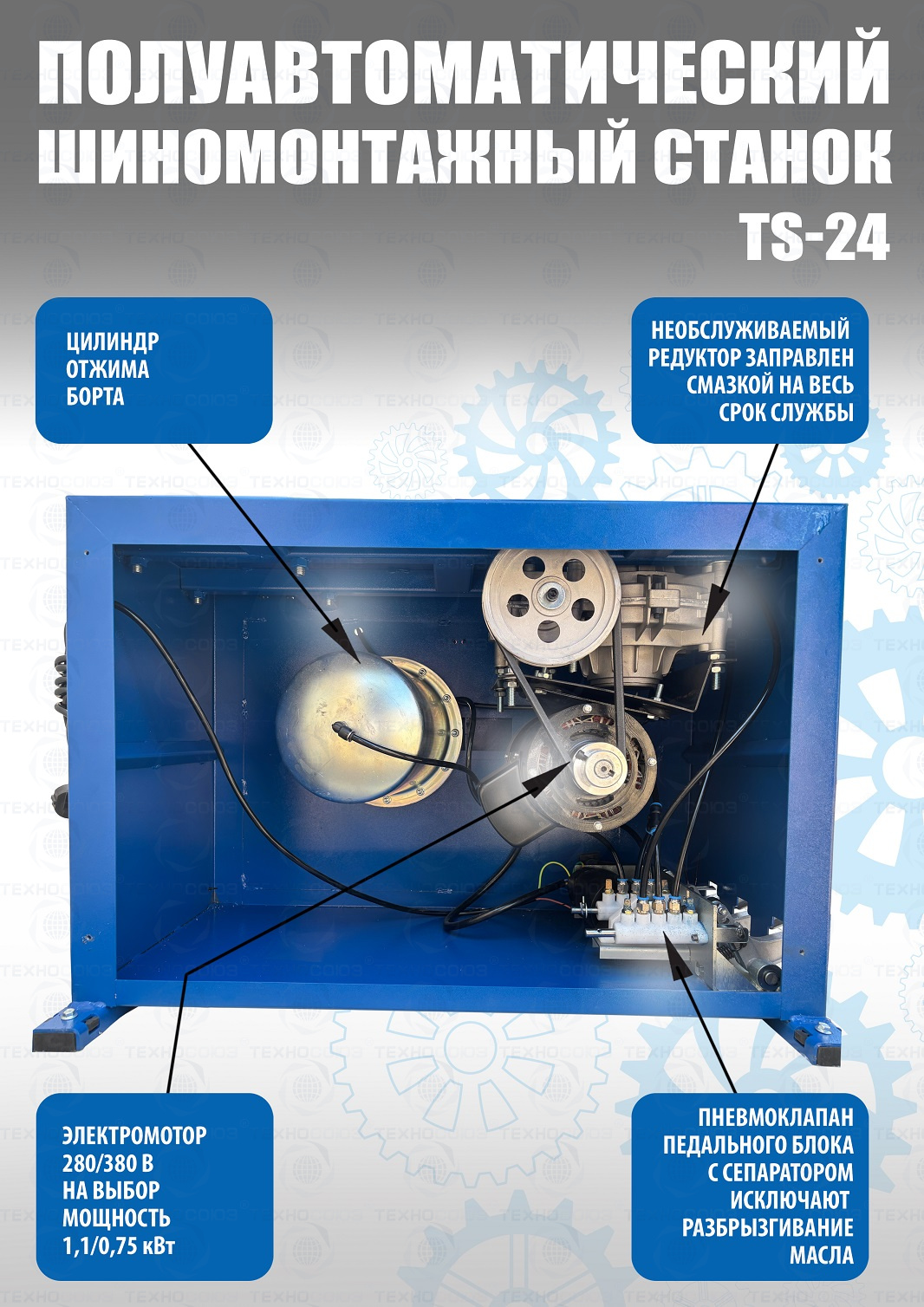 Шиномонтажного станка TS-24. Полуавтоматический. Квадратный стол. Для дисков:11÷24”. Усилие отрыва покрышки 2700 кг. В комплекте: пистолет с манометром для подкачки шин + монтажка + пластиковые накладки на зажимные кулачки + регулятор давления с влагоотделителем и манометром. Надежные - не подведут в сезон!!!  Напряжение шиномонтажных станков 220В или 380В на выбор.