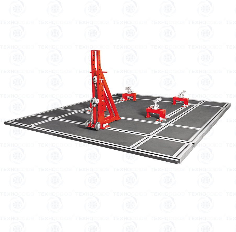Основа кузовного стенда - модульная рама, которая собирается с помощью крепежных деталей и монтируется в подготовленный приямок заподлицо с полом. Модульная система позволяет легко собирать один или несколько постов необходимых размеров.