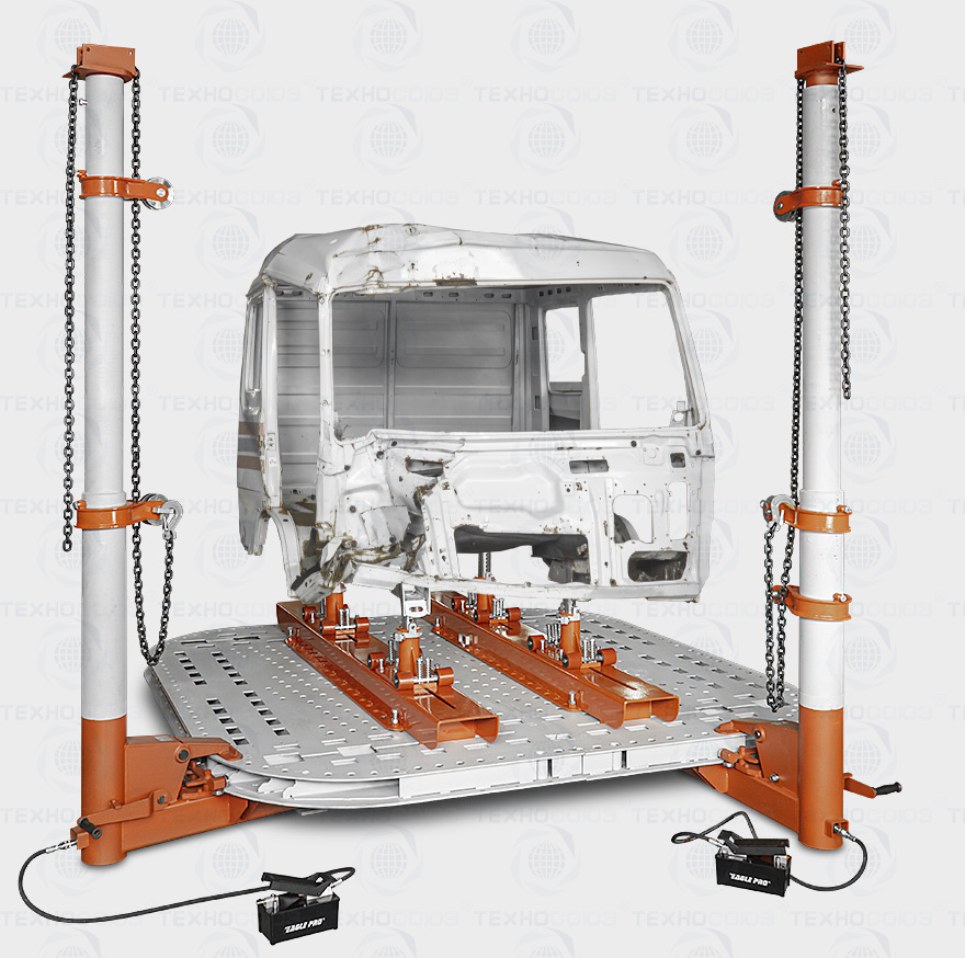 Силовые устройства башенного типа высотой 3 м оснащены гидроцилиндрами 10 т и позволяют быстро и эффективно восстановить геометрию вертикальных элементов каркаса и крыши кабины. Для управления силовыми устройствами используются пневмогидравлические насосы.