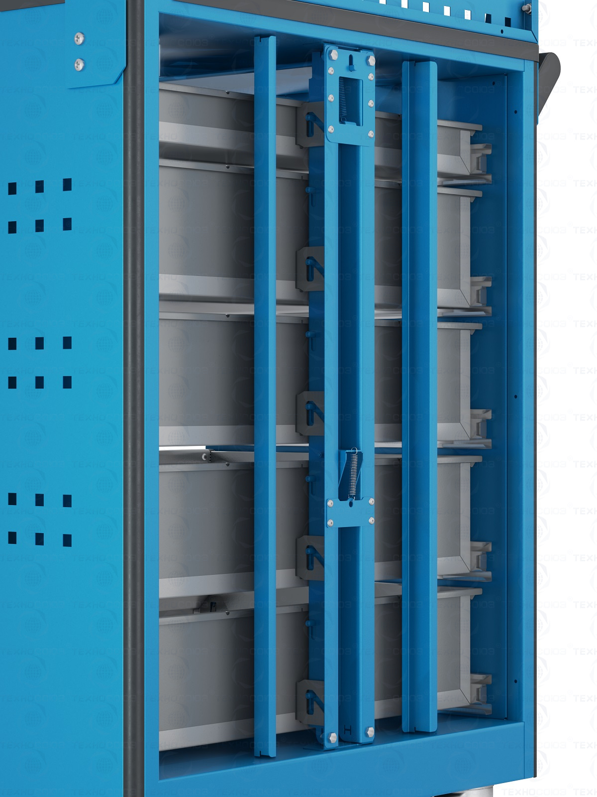 Ящики устанавливаются на шариковых телескопических направляющих полного выдвижения. Обеспечен свободный и плавный ход ящиков даже при полной загрузке. На лицевой панели каждого ящика установлена ручка-накладка. Каждый ящик снабжен клавишной системой антиоткрывания из оцинкованной стали, препятствующей самопроизвольному выдвижению ящиков, например, при наклоне или перемещении тележки.