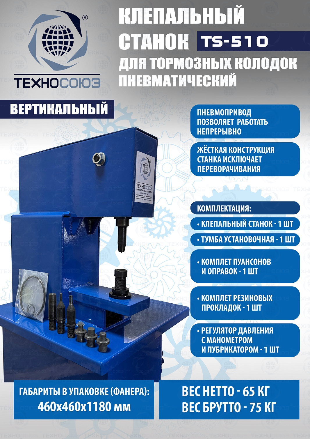 Вертикальный. Тип – пневматический. Управление – педалью. Напольный. Материал клёпки – медь, алюминий D= 6 / 8 / 10 мм. Усилие до 6т. Клепальный станок для тормозных колодок, фрикционных дисков сцепления легковых и грузовых автомобилей, автобусов. В стандартной комплектации предусмотрены пуансоны для работы с отечественными и импортными автомобилями. Требуется подключение к компрессору. Рабочее усилие клепальный станок развивает с помощью сжатого воздуха.