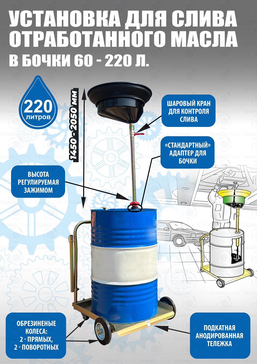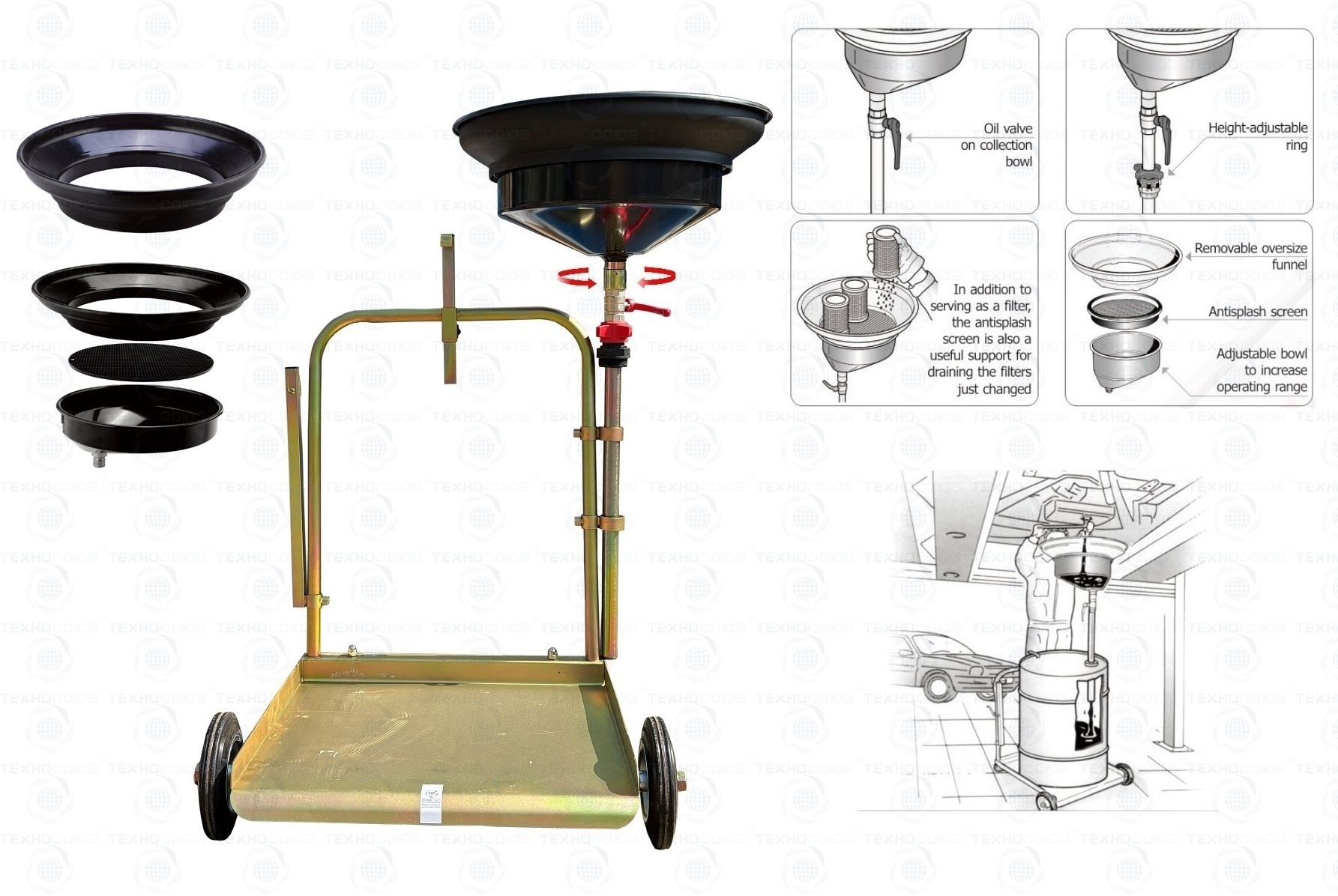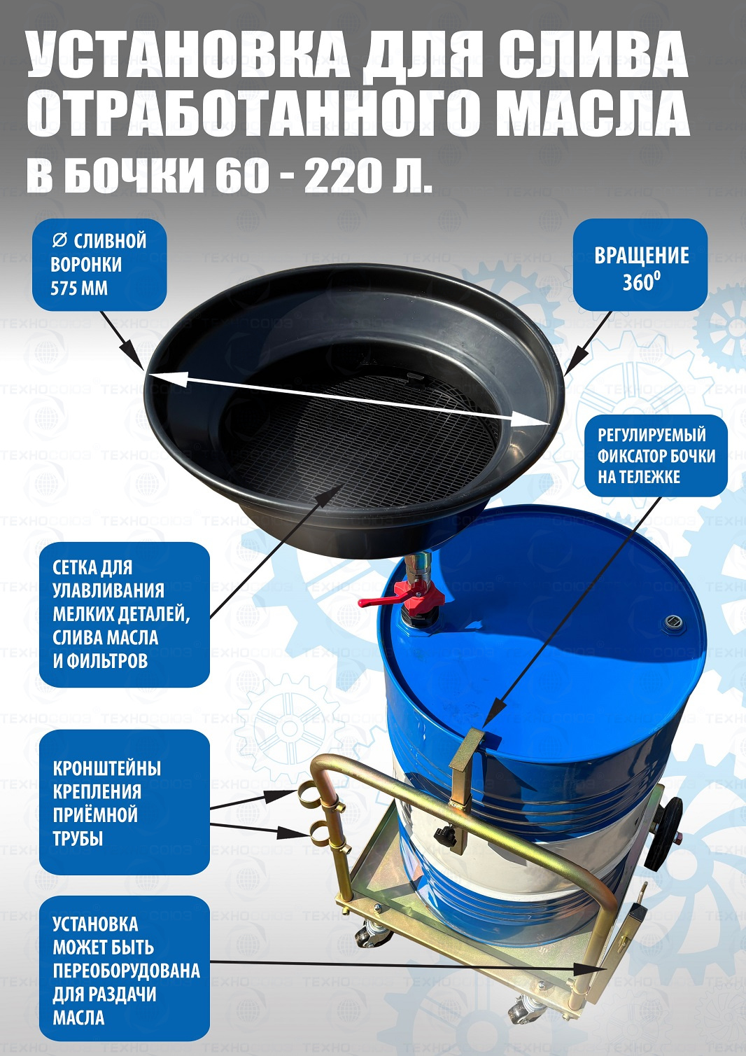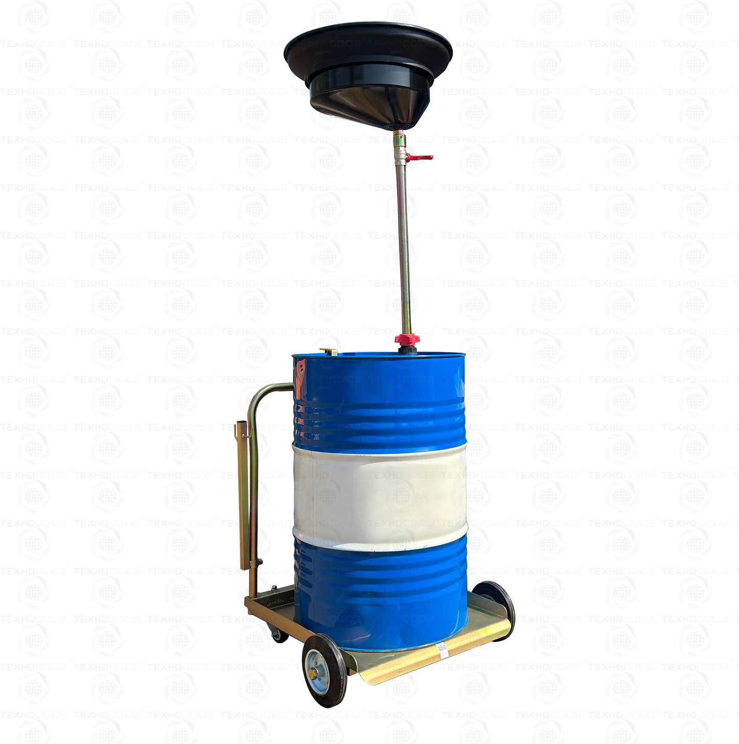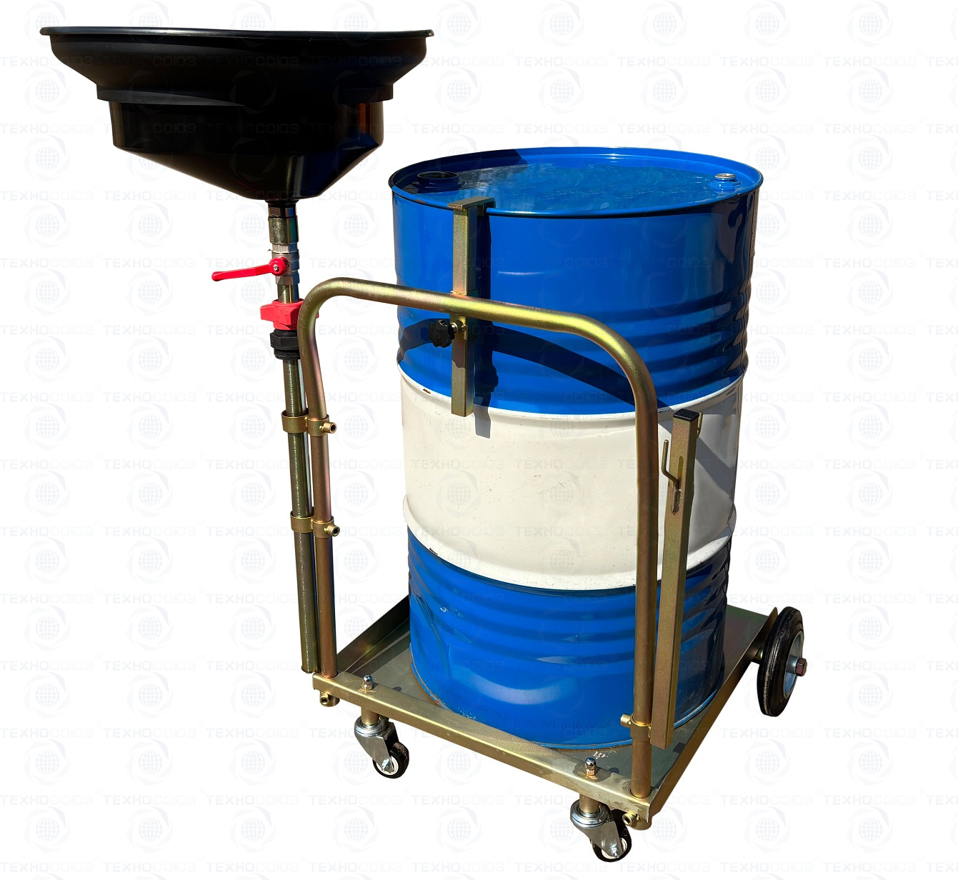 Установка для слива/сбора «отработки», антифриза в бочки 60÷220л. на подкатной анодированной тележке. Для любых транспортных средств, вывешенных на подъёмнике. Высота регулируется зажимом 1450÷2050мм. Фиксатор бочки на тележке. Сетка для улавливания мелких деталей, фильтров и предотвращения разбрызгивания. Поворотная воронка 360⁰ со смещённым сливным отверстием. Шаровой кран для контроля слива. Обрезиненные колёса большого диаметра для не ровных полов. Контроль заполняемости бочки через отверстие для воздуха.