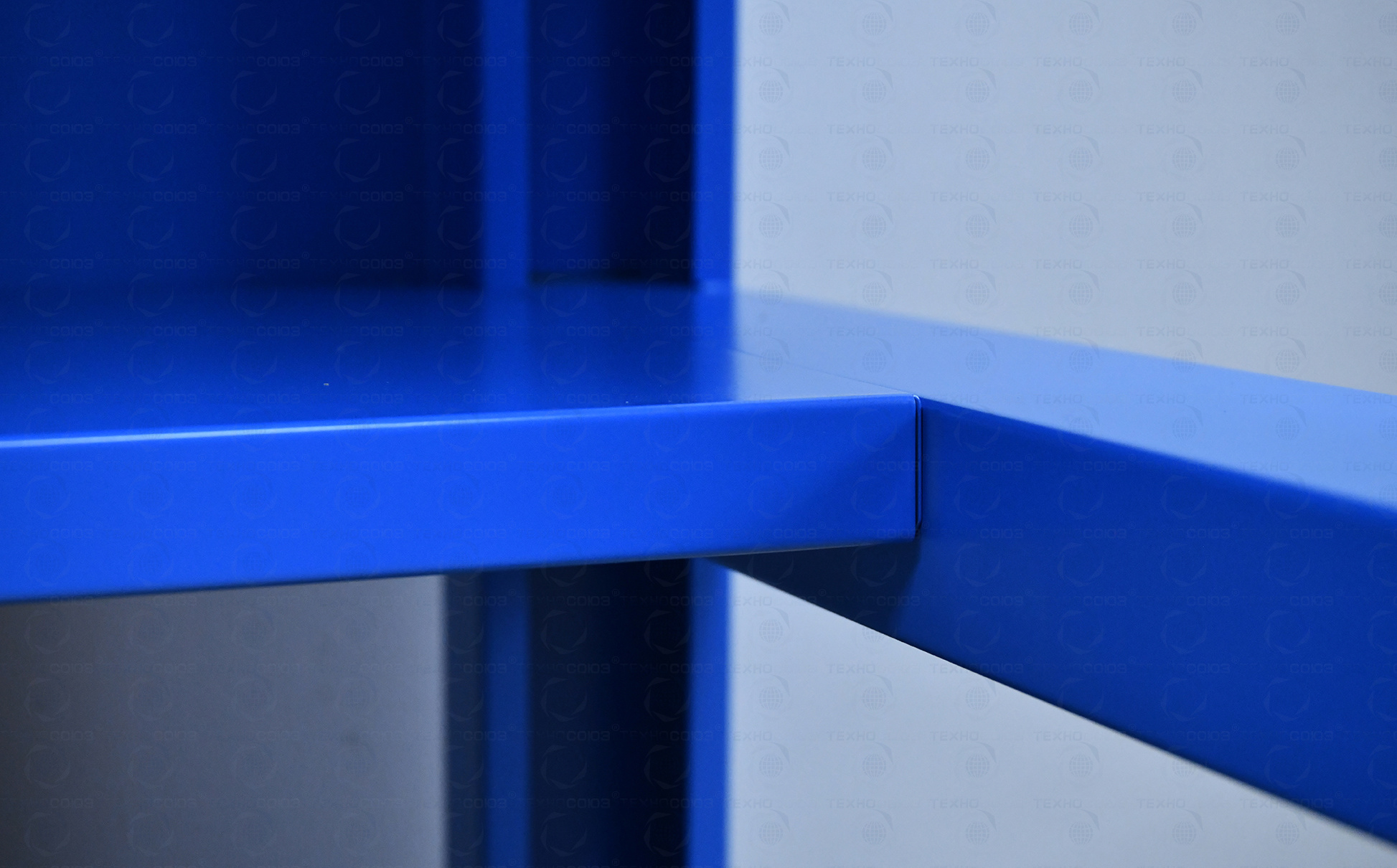 Все металлические элементы покрыты полиэфирной порошковой краской, обеспечивающей хорошую износостойкость покрытия и невосприимчивость его к моющим средствам и смазочным веществам. Цвет и текстура покрытия корпуса тумб, опор, полки-стенки, экранов и комплектов освещения RAL 5015, гладкая, полуматовая. Цвет и текстура покрытия ящиков и дверок верстака, кронштейнов экранов и косынок RAL 7037, гладкая, глянцевая. Цвет и текстура покрытия накладок ручек ящиков и дверок RAL 9006, гладкая, глянцевая.