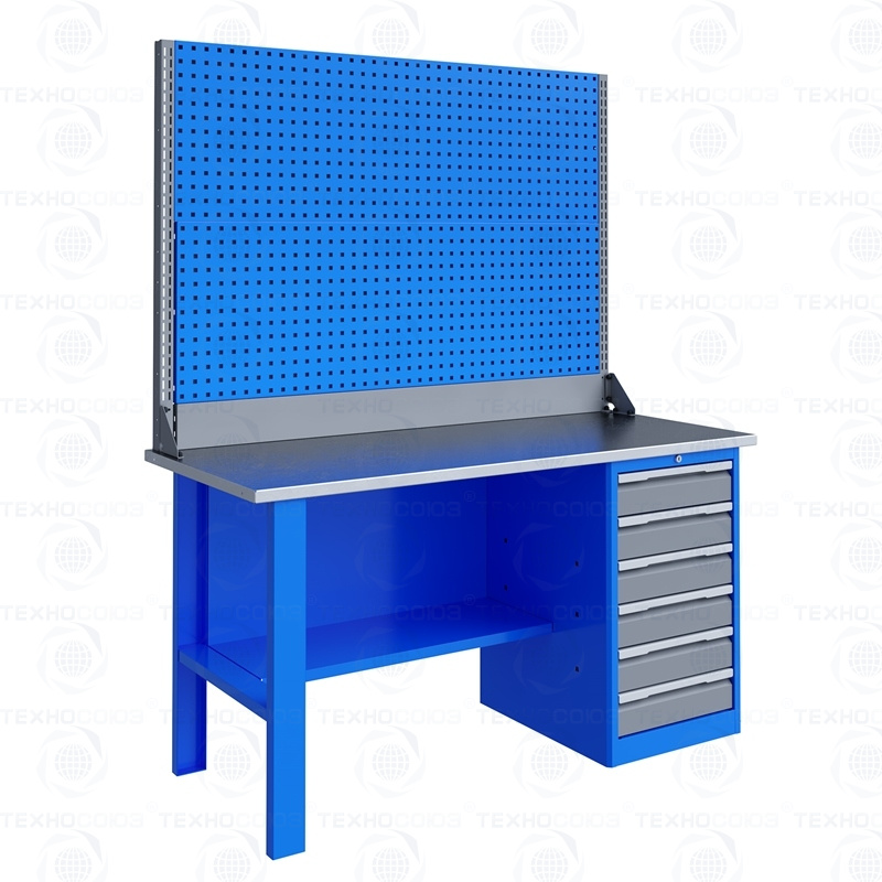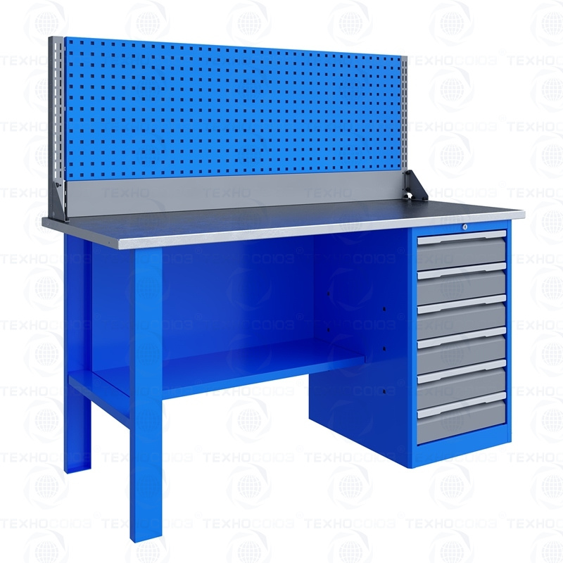 Однотумбовый. Допустимая нагрузка на столешницу 750 кг. Опорные элементы выполнены сварными из холоднокатаной стали. Для выполнения сборочных, ремонтных, слесарных, монтажных и других видов работ на производстве, в сервисных центрах, мастерских, гаражах, а также для обучения технологии в учебных заведениях. Комплектуется полкой-стенкой, расположенной под столешницей для удобного размещения габаритного инструмента и оснастки. Размеры верстака: 855x1596x696 мм. Вес: 88 кг. Поставляется в 4 комплектациях на выбор.